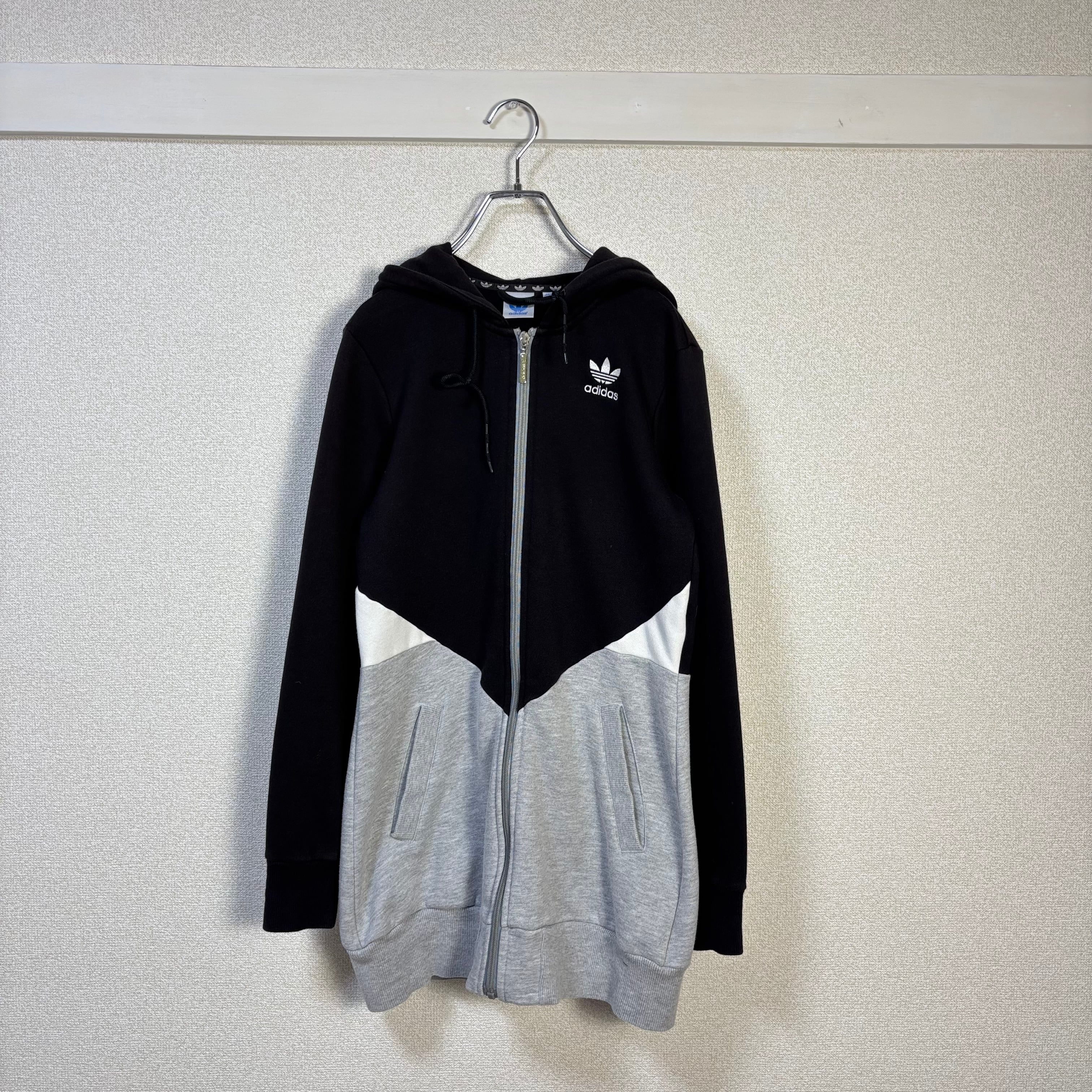 ブラック・ホワイト・グレーの切替デザインが目を惹くadidasのフルジップパーカー。