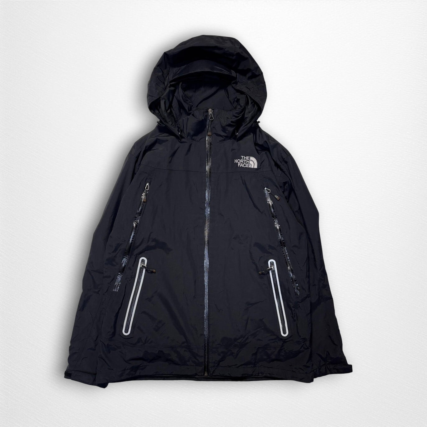また、背面に細かな白い点状の反射のような跡が見られます(粉汚れではなく、HYVENT素材特有の経年によるコーティングの浮きや光の反射で確認されるものです)。