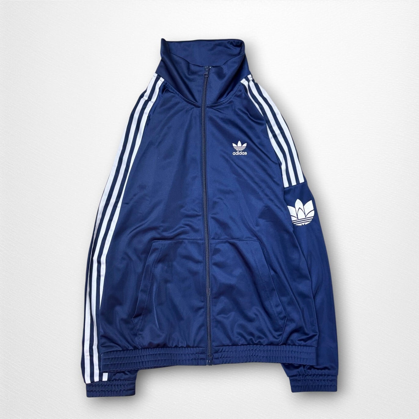 ・特徴:フルジップ仕様、スタンドカラー、両サイドポケット、袖口・裾リブ、3ストライプデザイン、胸トレフォイルロゴ、左袖ビッグトレフォイルプリント、韓国買い付け古着