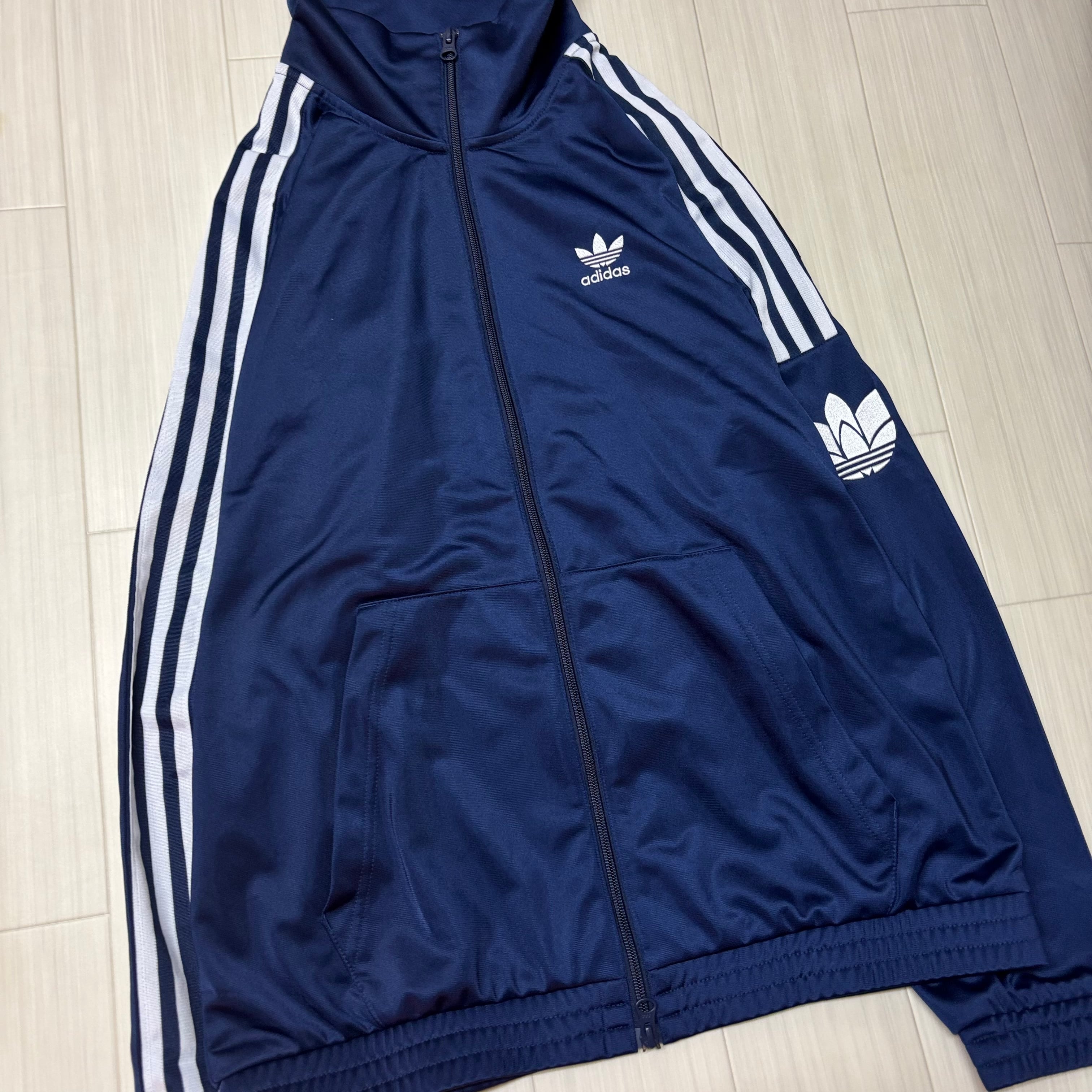 光沢のあるネイビーボディに、袖まで入った3ストライプと胸のトレフォイルロゴが映える一枚です。