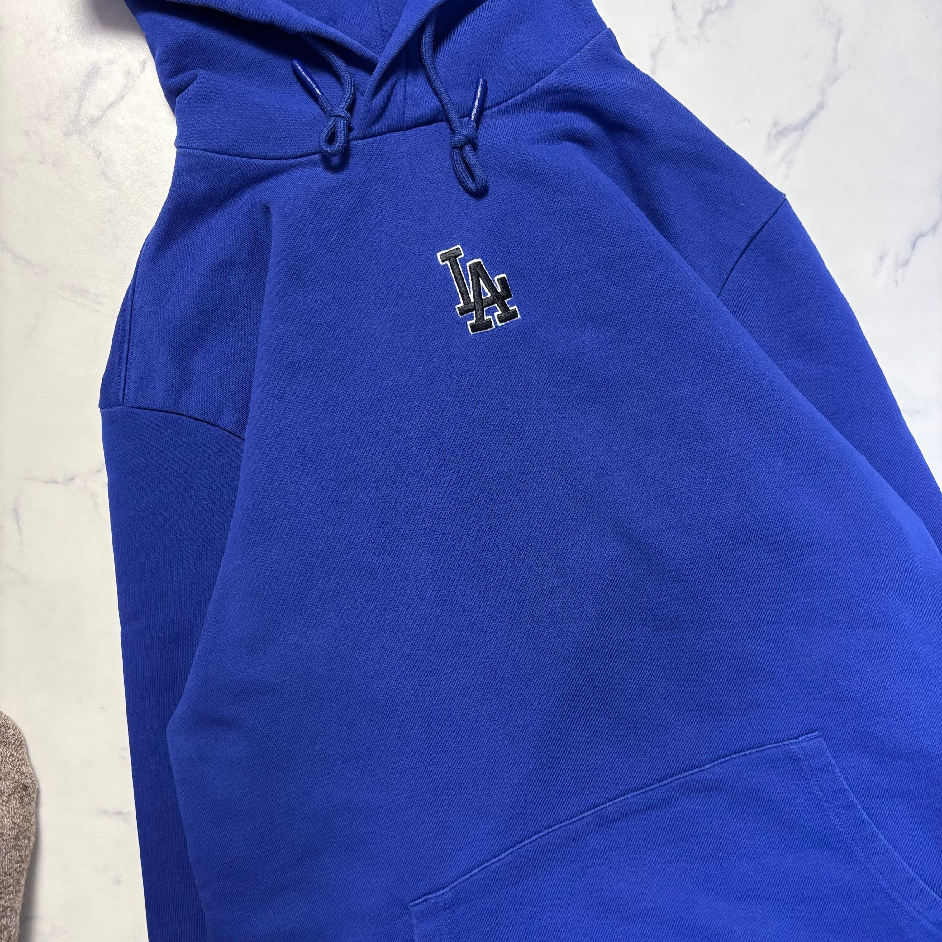 韓国MLBより、鮮やかなロイヤルブルーが存在感を放つドジャースロゴ刺繍パーカーの入荷です。