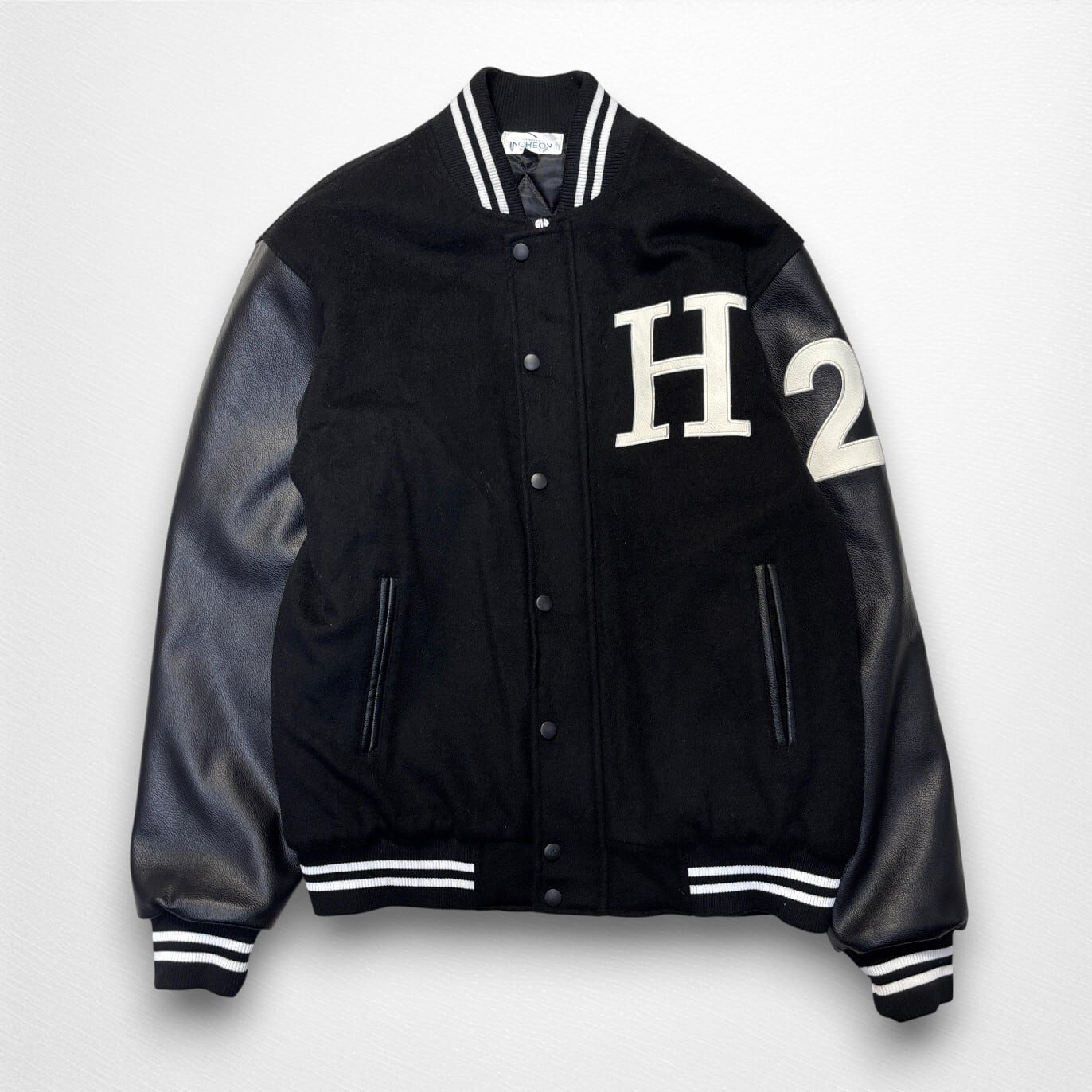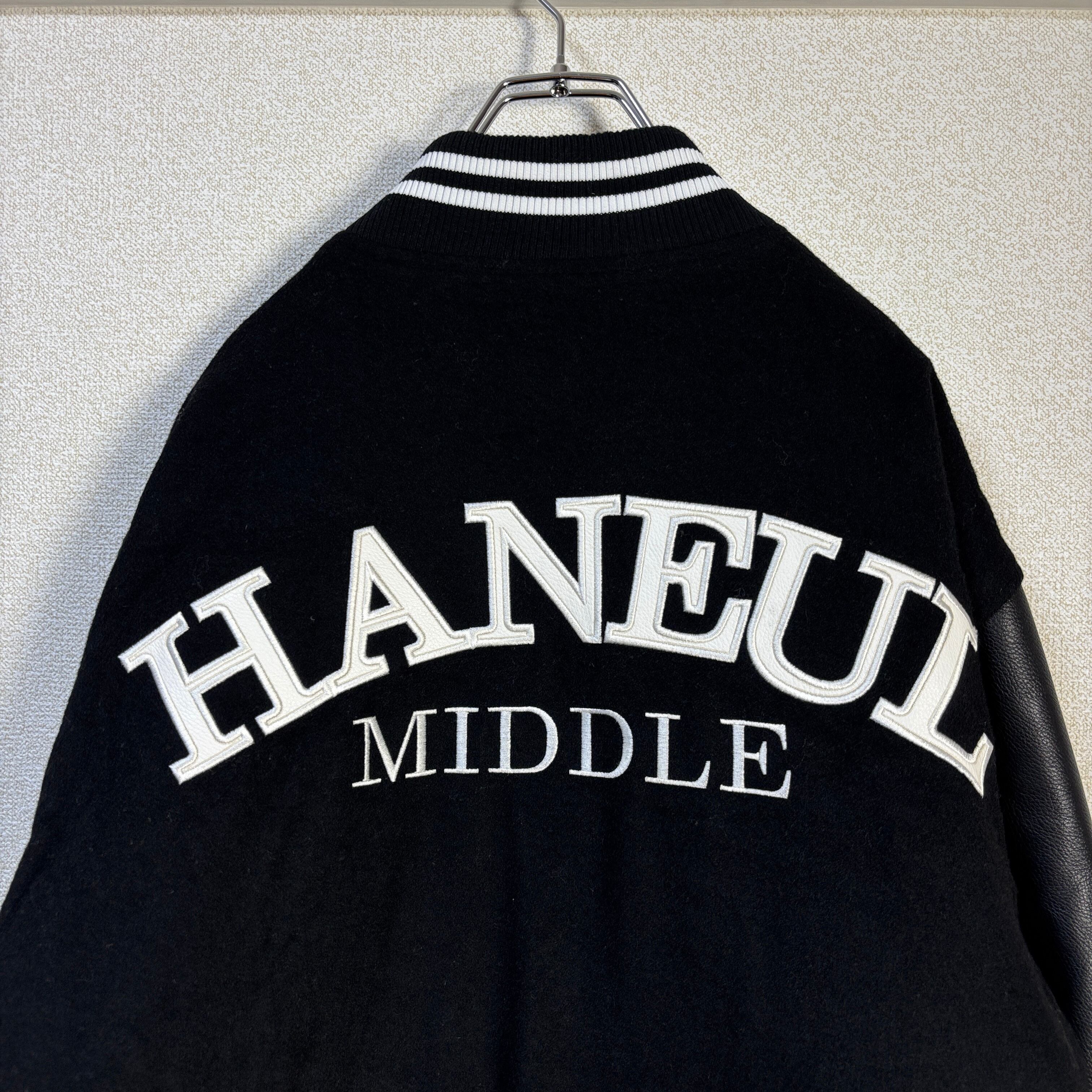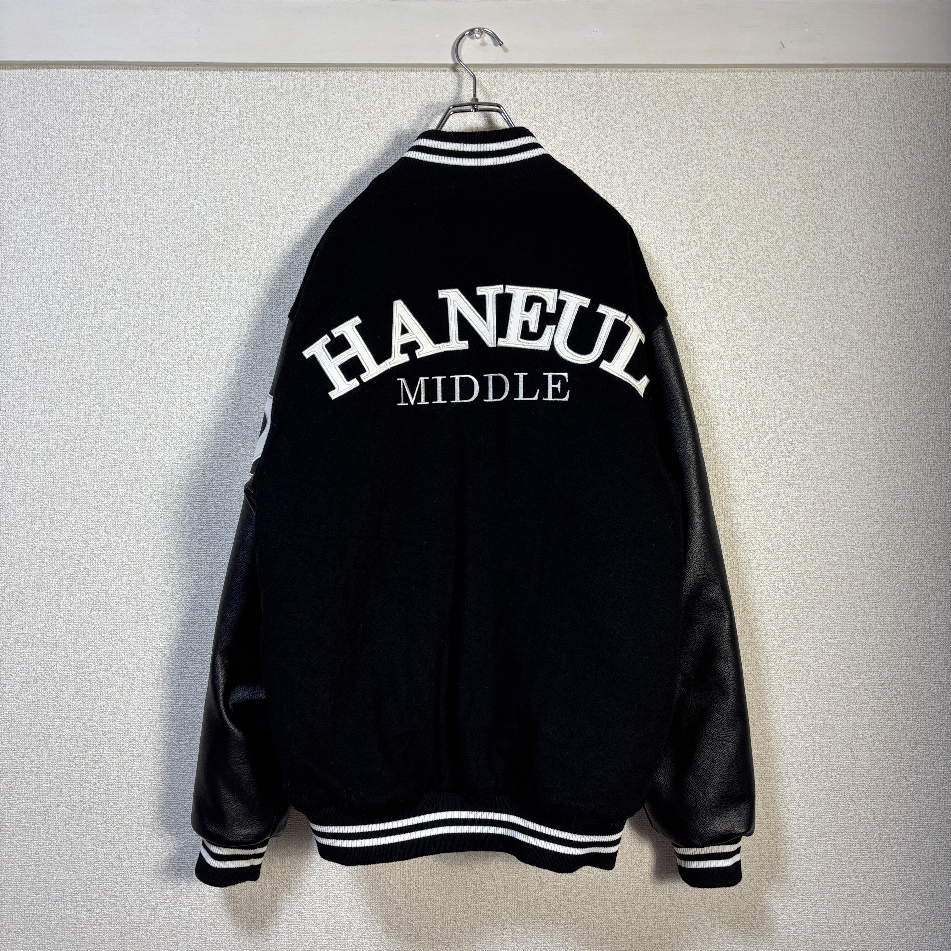 韓国大学スタジャン特有のデザインバランスで、ウール混ボディ×レザー切替スリーブの本格仕様。