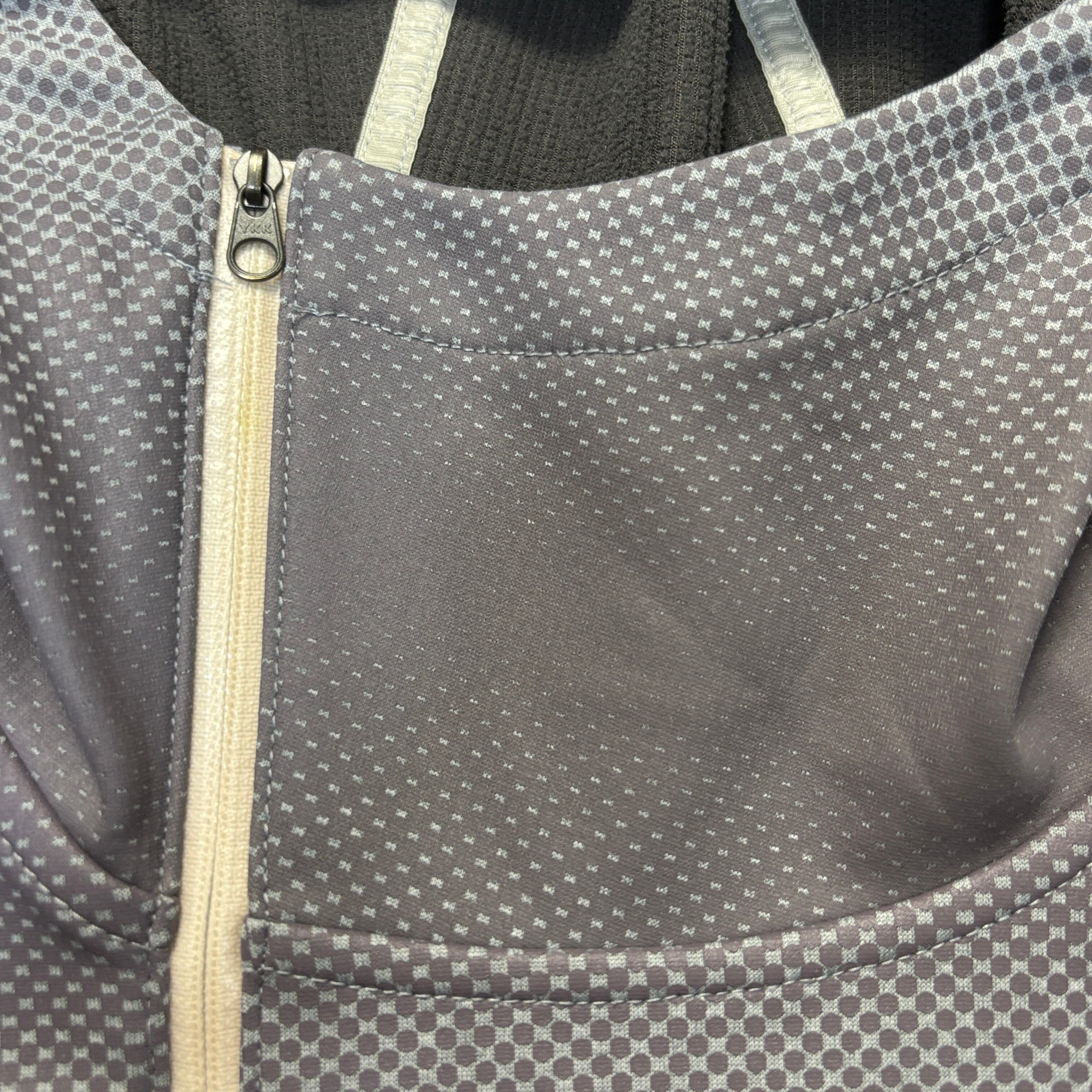 落ち着いたチャコールグレーをベースに、細かなドットパターンと切替デザインが映える一着。