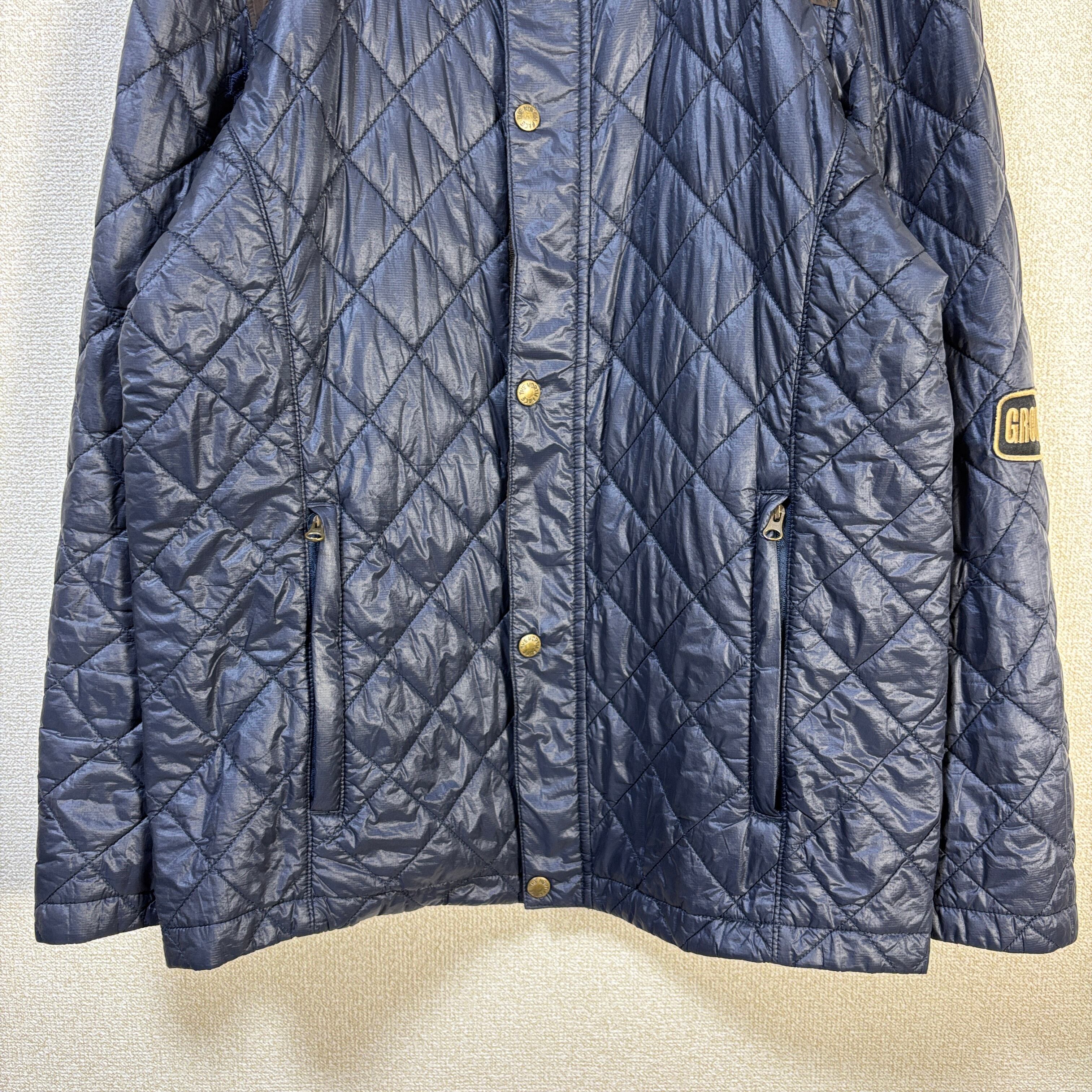 ネイビーのダイヤキルトにブラウンのヨーク切替、首元のレザーベルトがクラシックな雰囲気を演出する一着です。