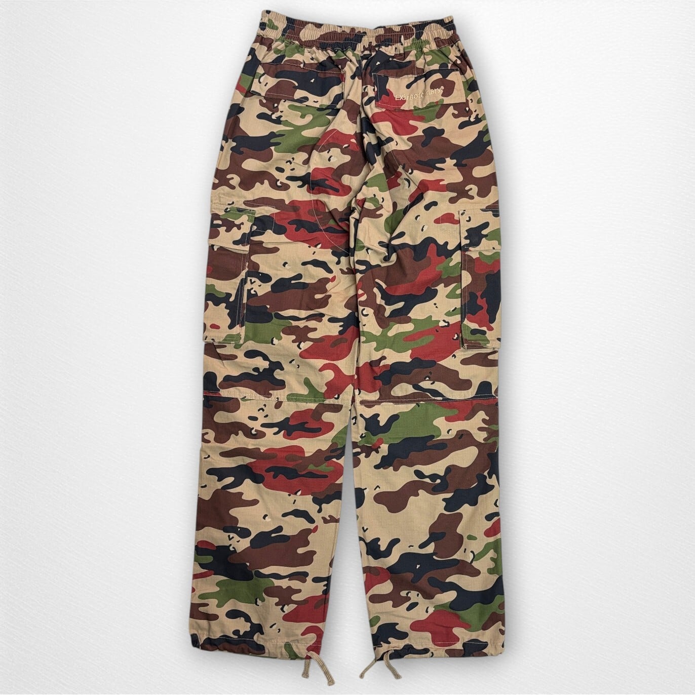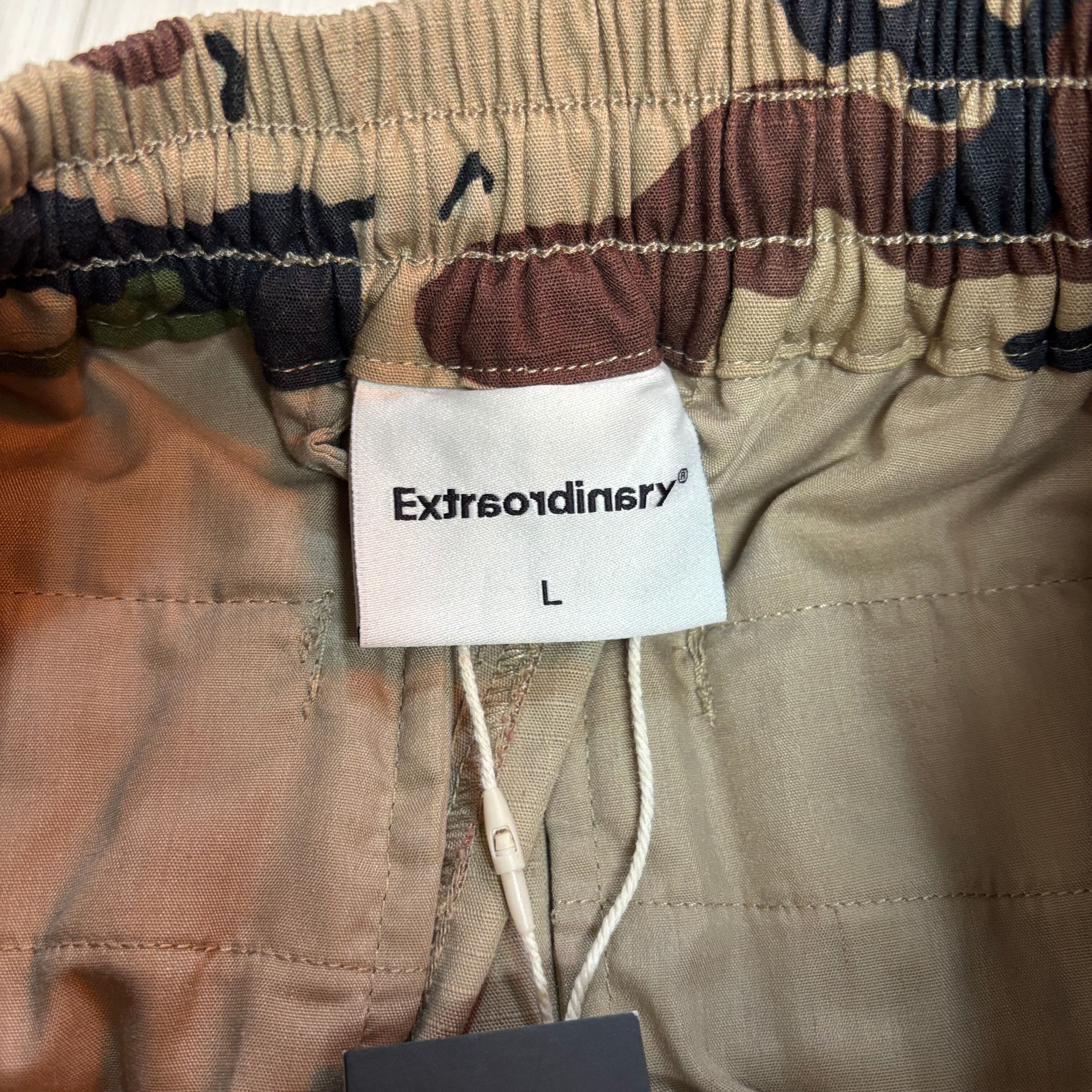 Extraordinary(エクストラオーディナリー)のアイテムで、ミリタリー調のカモフラージュ柄とワイドシルエットが印象的な一本。