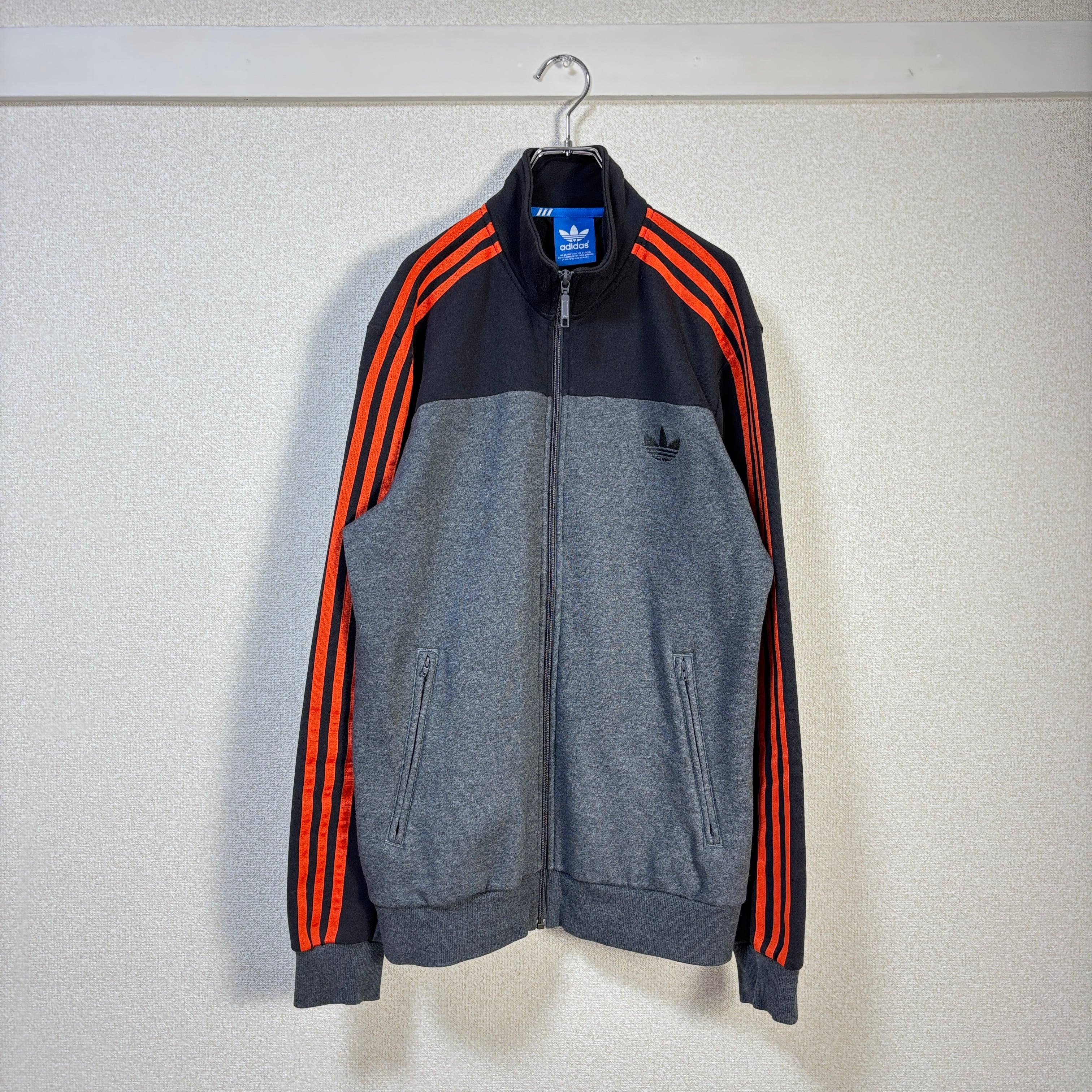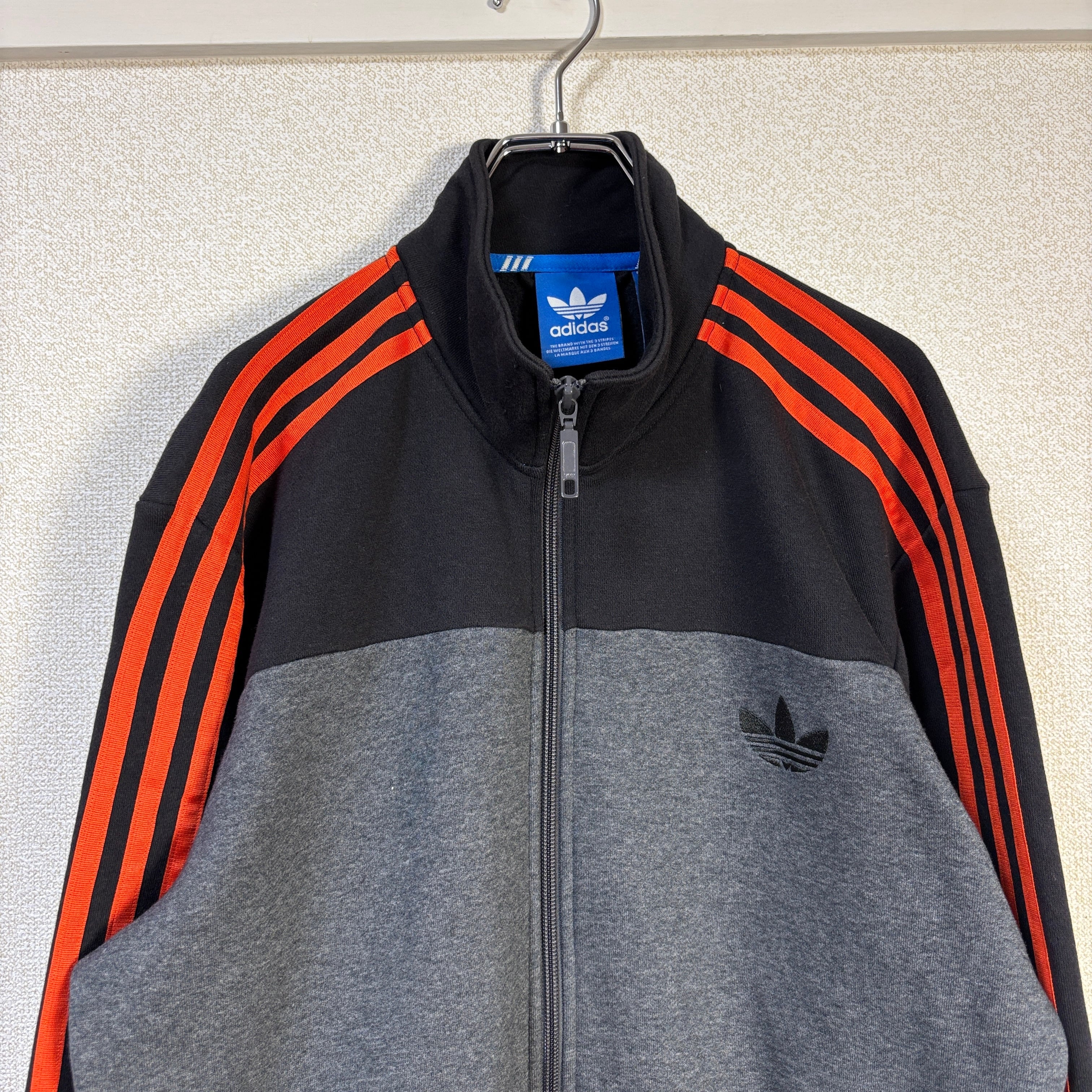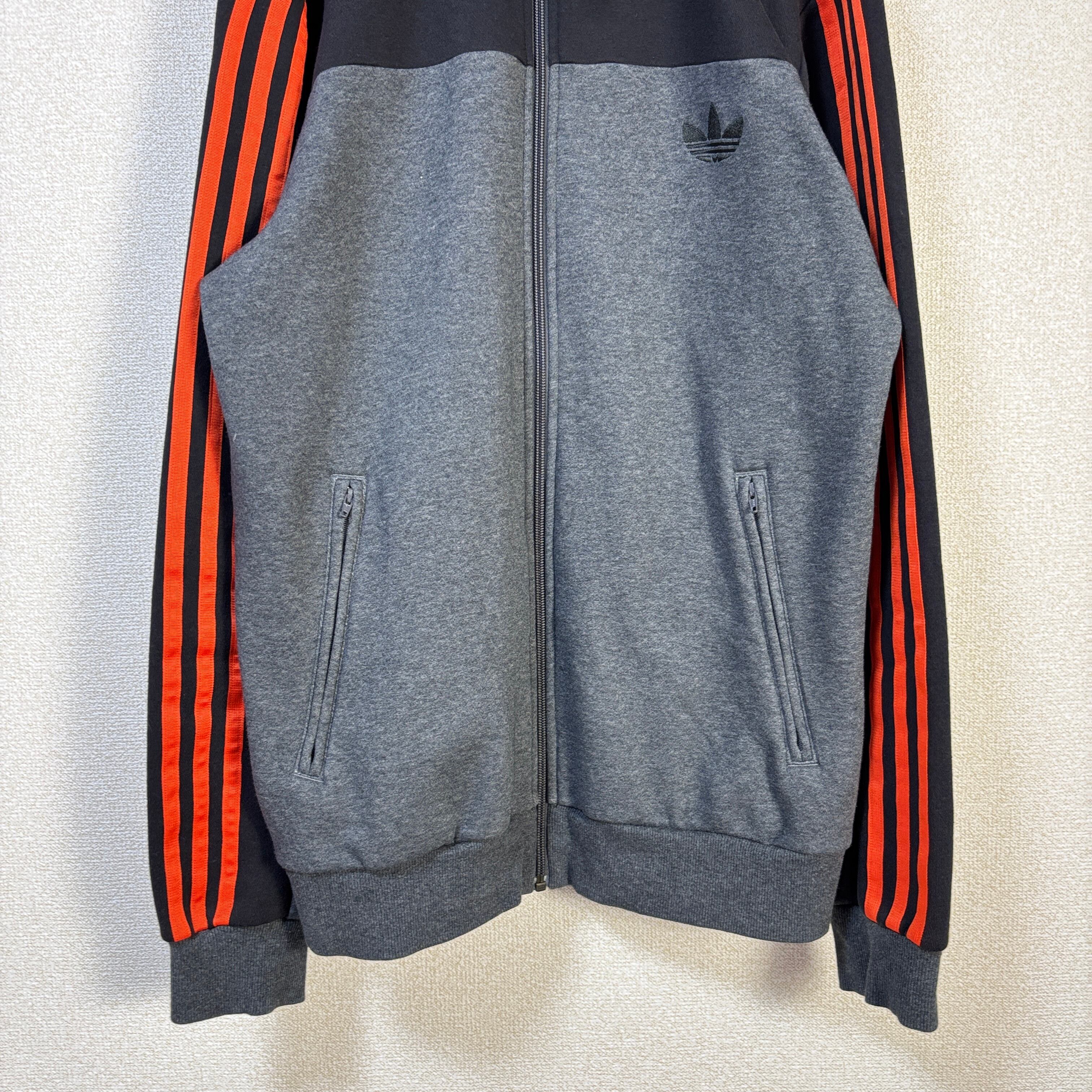 フロントは落ち着いたグレー×ブラックの切り替え、袖のレッド3ラインがしっかり映える、存在感のあるadidas Originalsのトラックジャケットです。