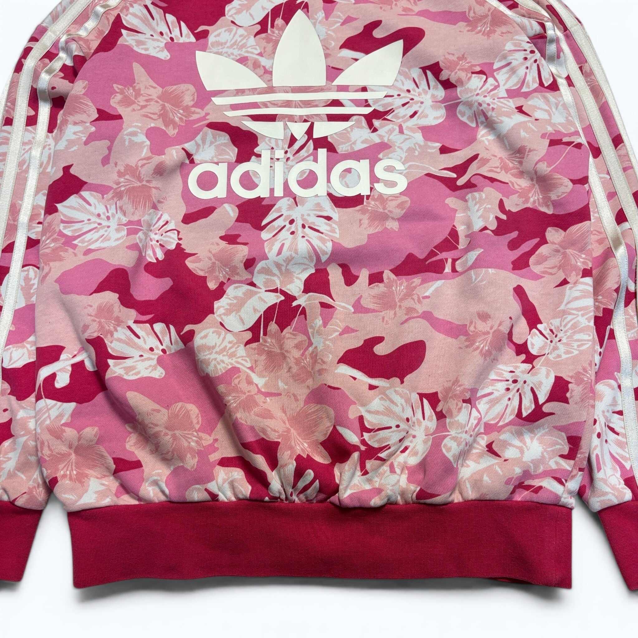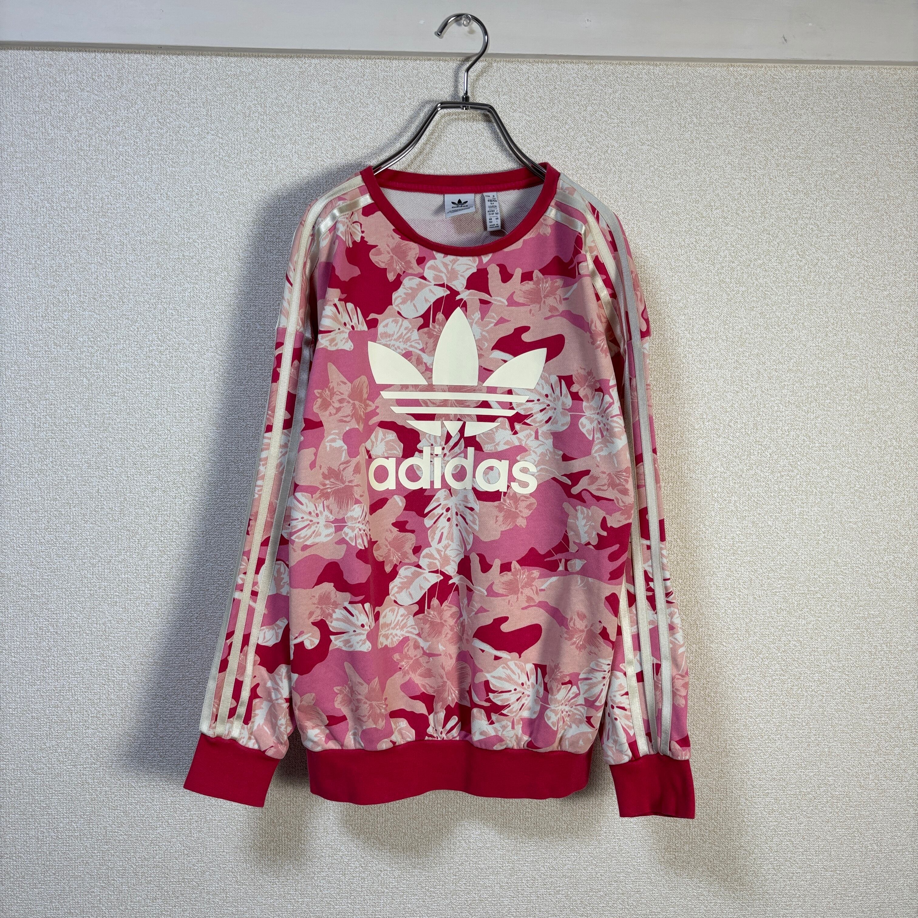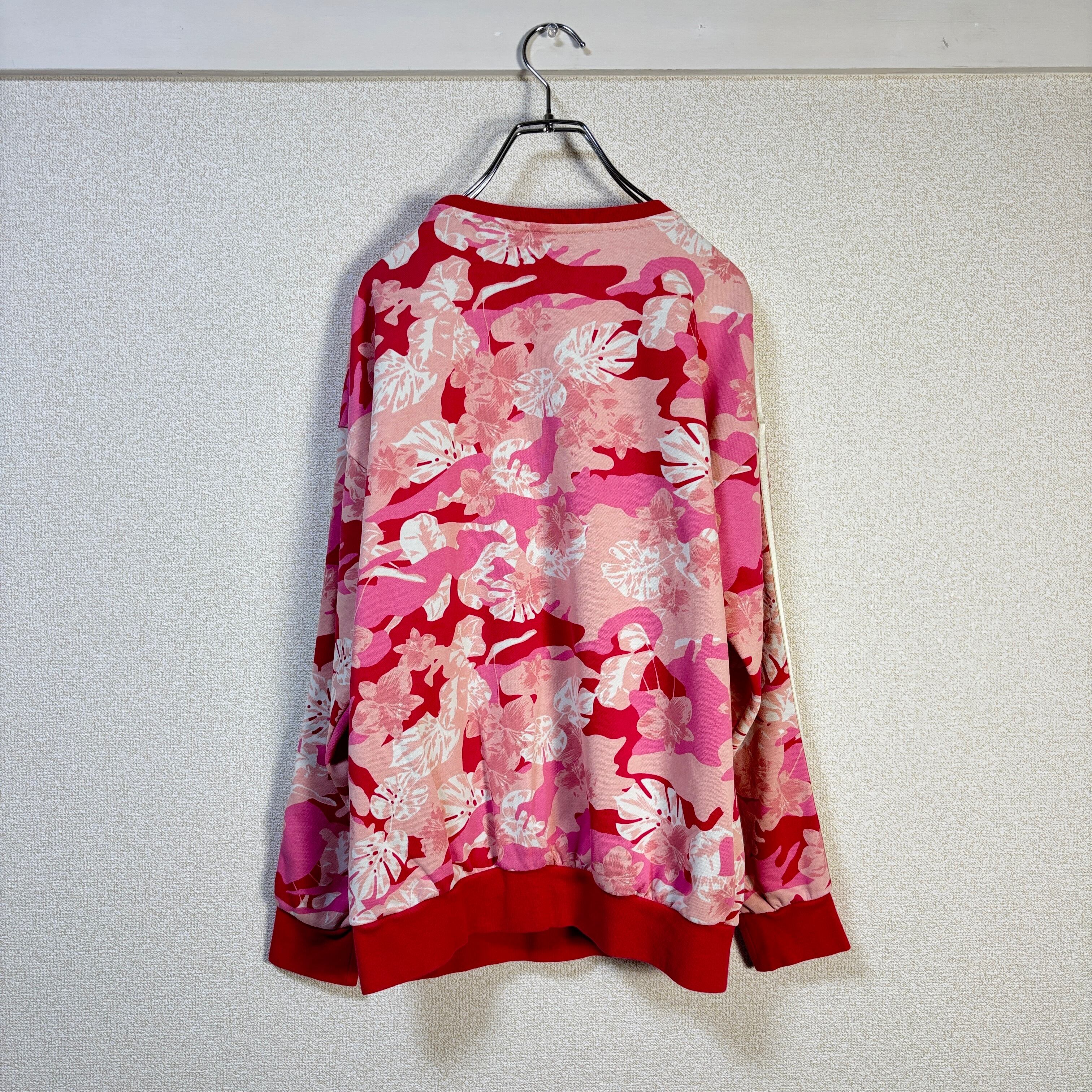 華やかなピンクベースに、フローラルモチーフとカモ柄を重ねた存在感のあるadidas Originalsのスウェットです。
