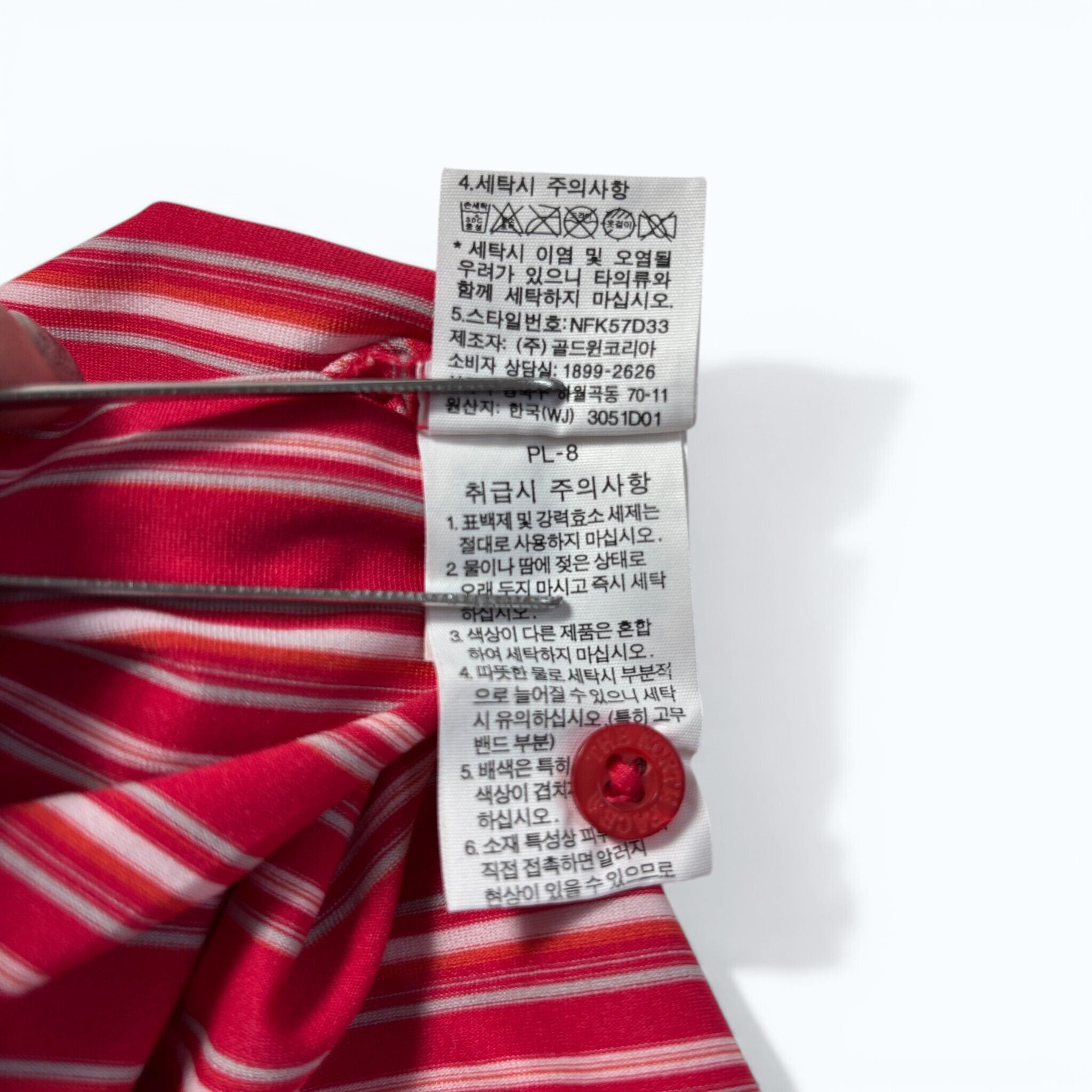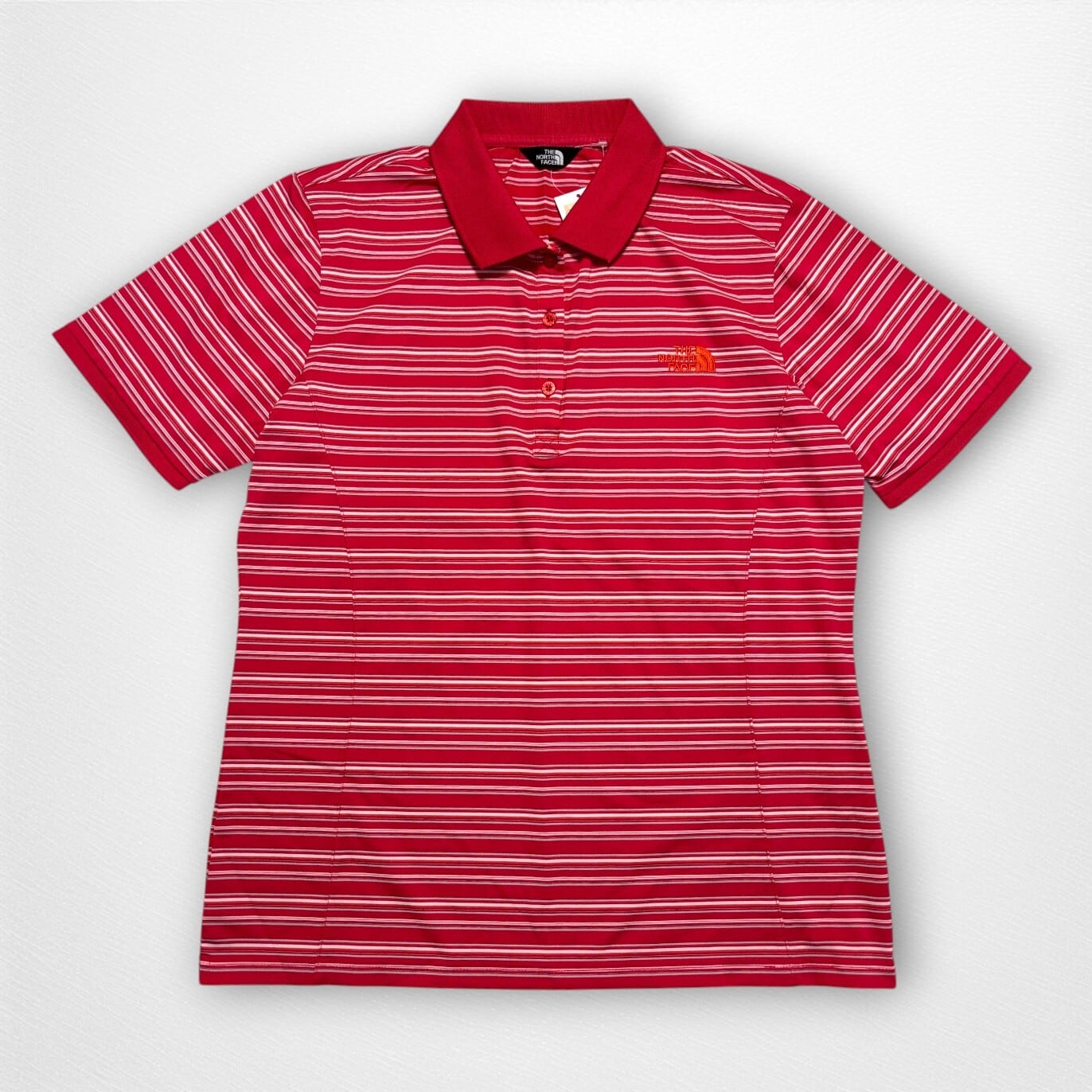 細かなボーダー柄と胸元のロゴ刺繍がバランスよく、スポーティーさの中にすっきりとした印象も感じられる一枚です。写真では赤みが強く見えますが、実物はもう少しピンク寄りの色味です。
